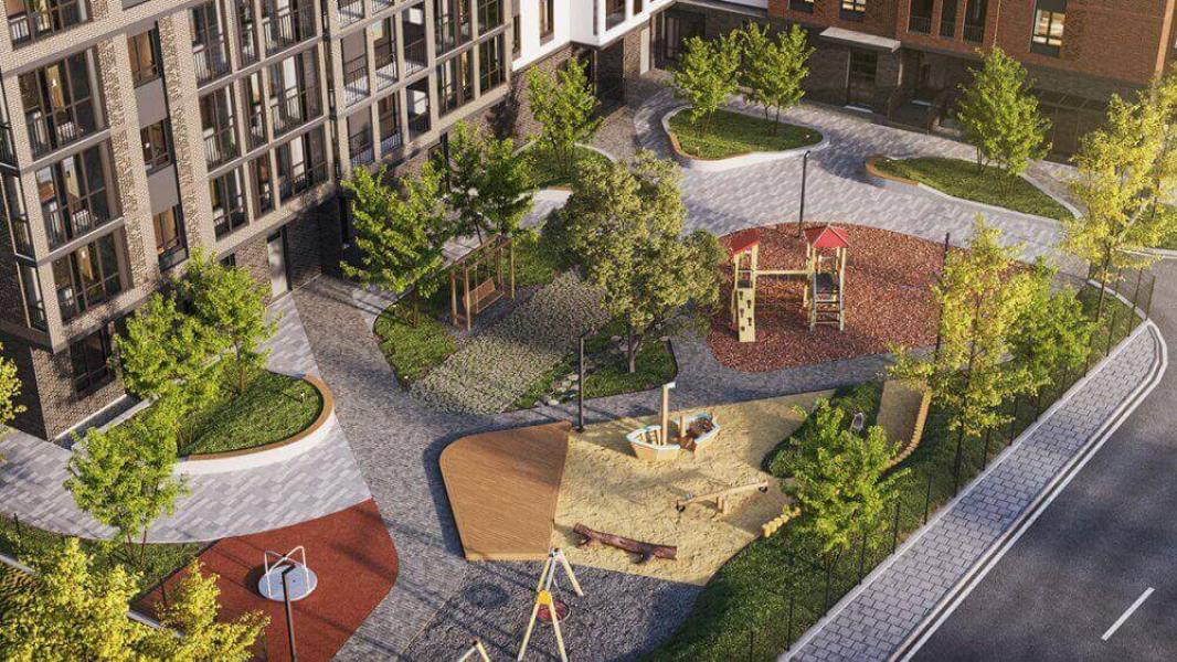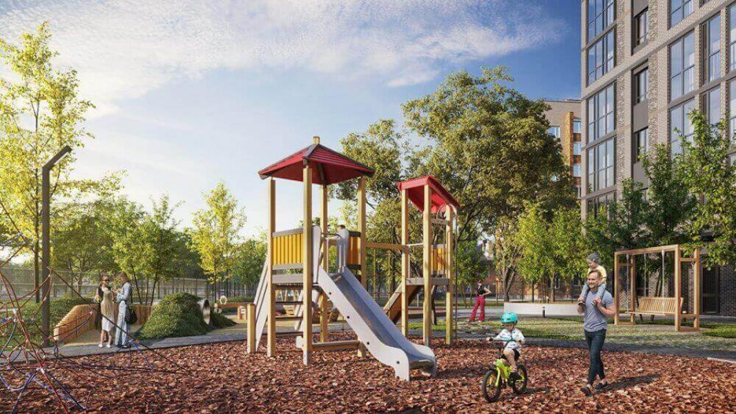 Игровая детская зона отделена от просторной парковки и запроектированы батуты, ландшафтный тоннель для искателей приключений, песочница для малышей и другие активности для разных возрастов. Чтобы прогулки были долгими, на первом этаже вы сможете воспользоваться туалетной комнатой.