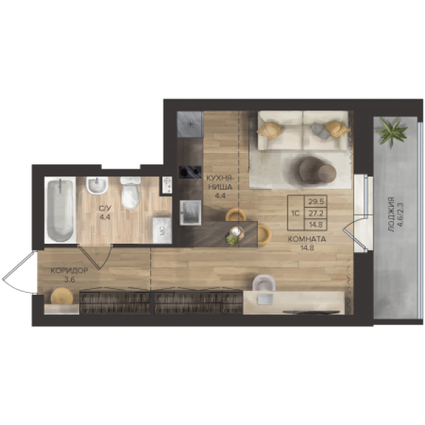 - 1К от 38.4 - 45.1 м² стоимость от 5 147 000 - 6 115 000 ₽
