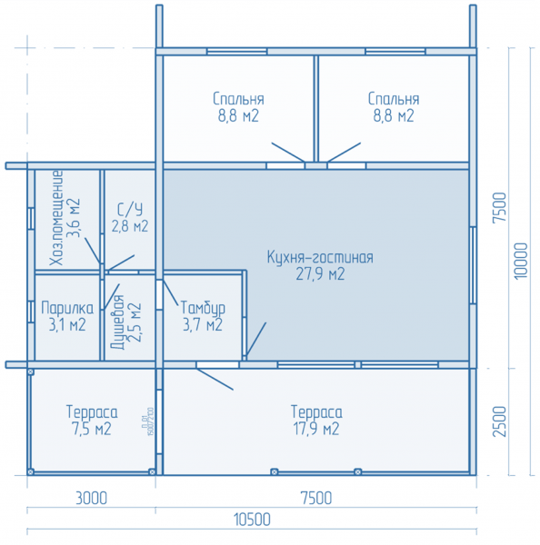 Входит: свайное поле, обвязка, теплый контур (стены, перекрытия нижние, верхние, межкомнатные стены, стропильная система, кровля, окна двери).