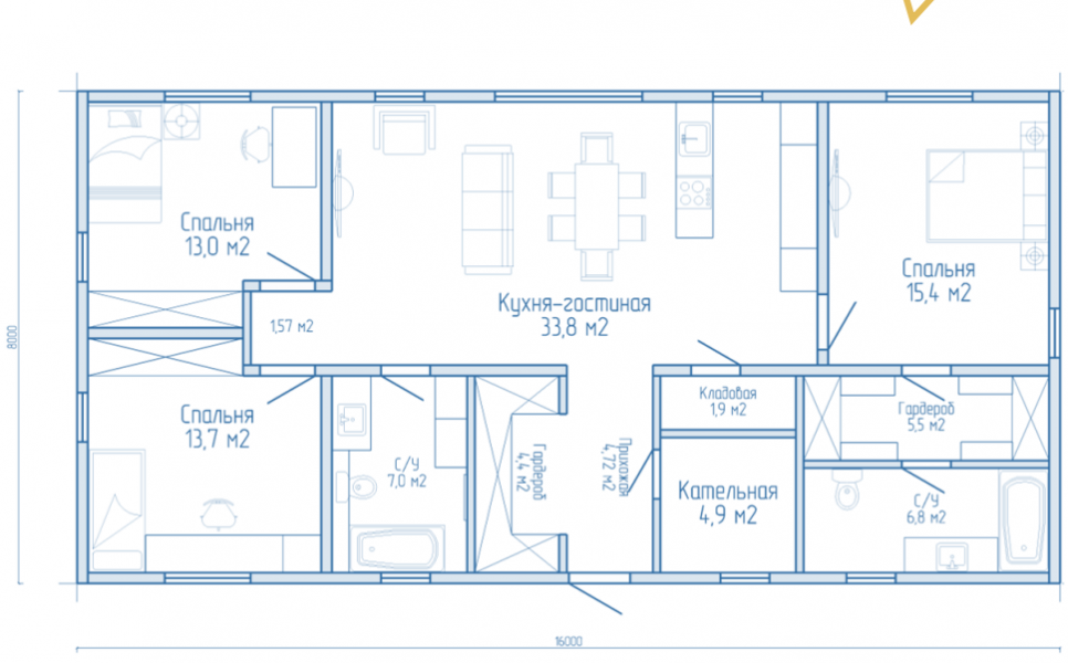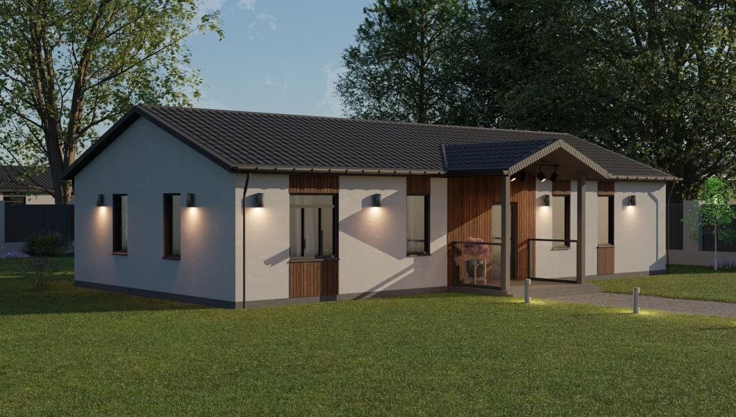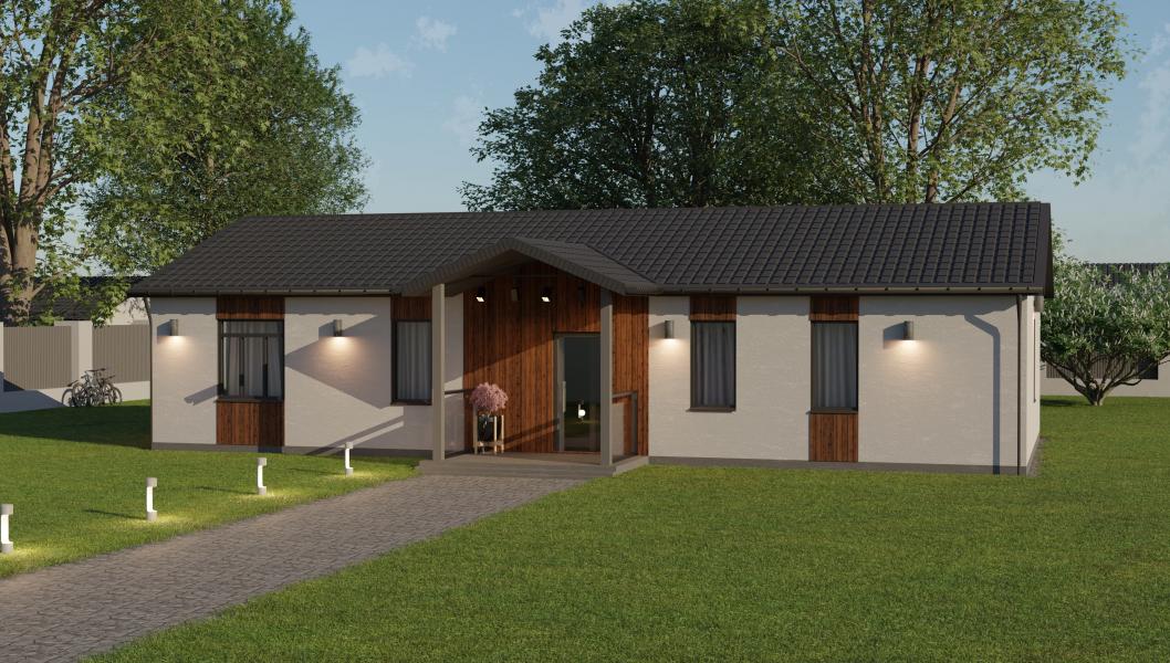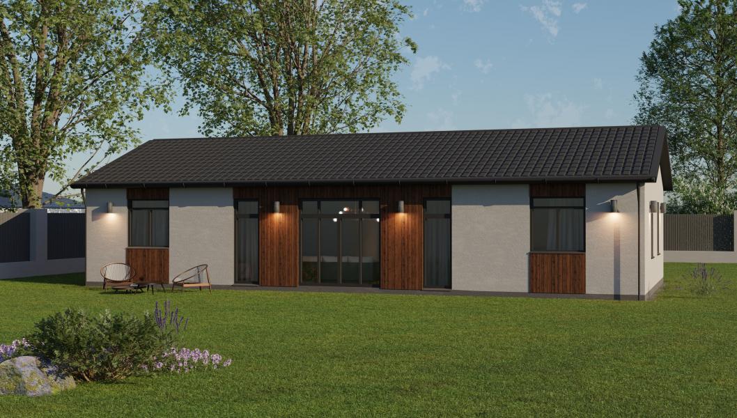 Входит: Дом под ключ, свайное поле, обвязка, теплый контур, фасад, софиты, цоколь, облицовка окон, септик, скважина до 25 метров, ввод эл. энергии, ввод воды, ввод в дом канализации.